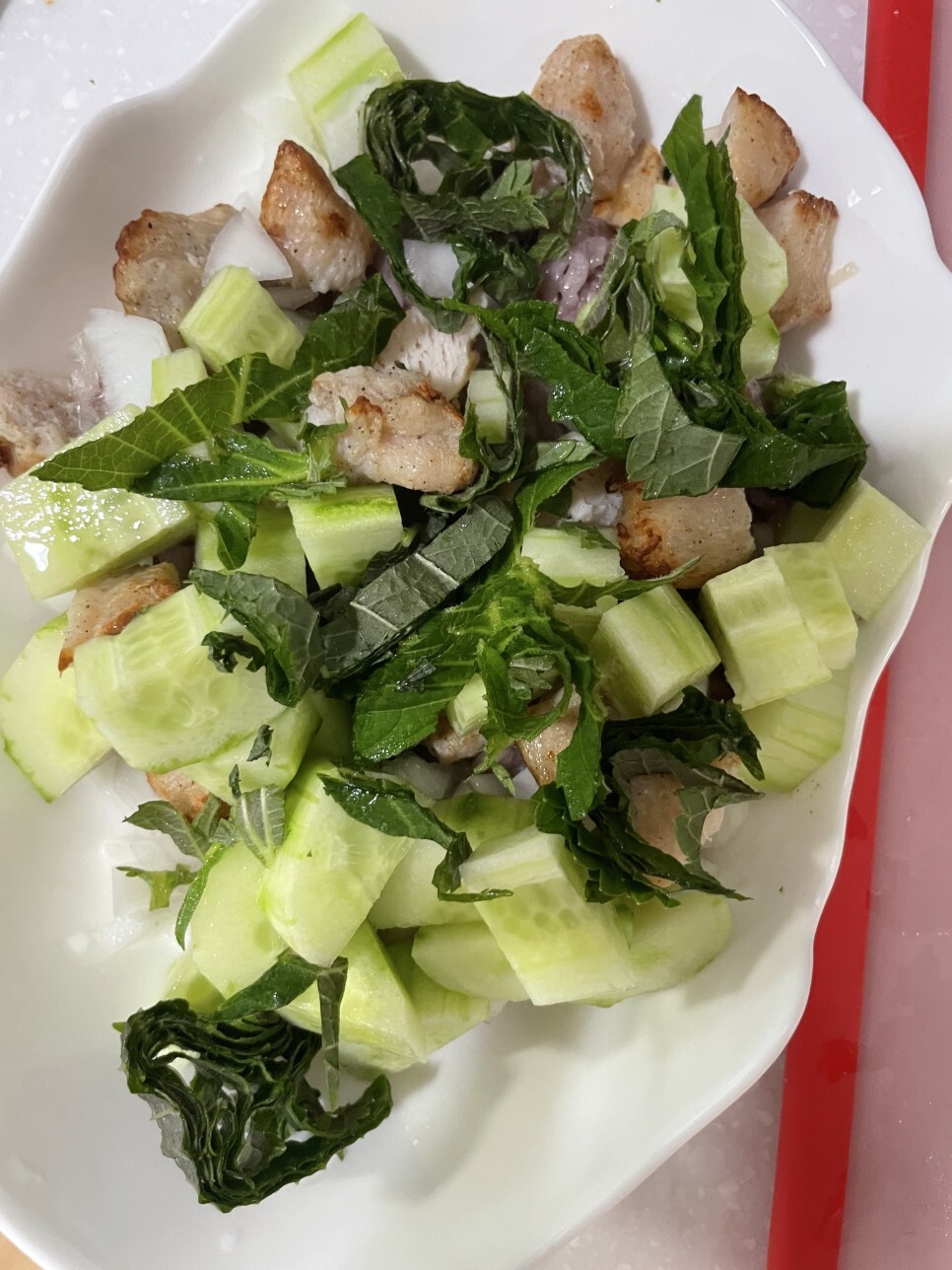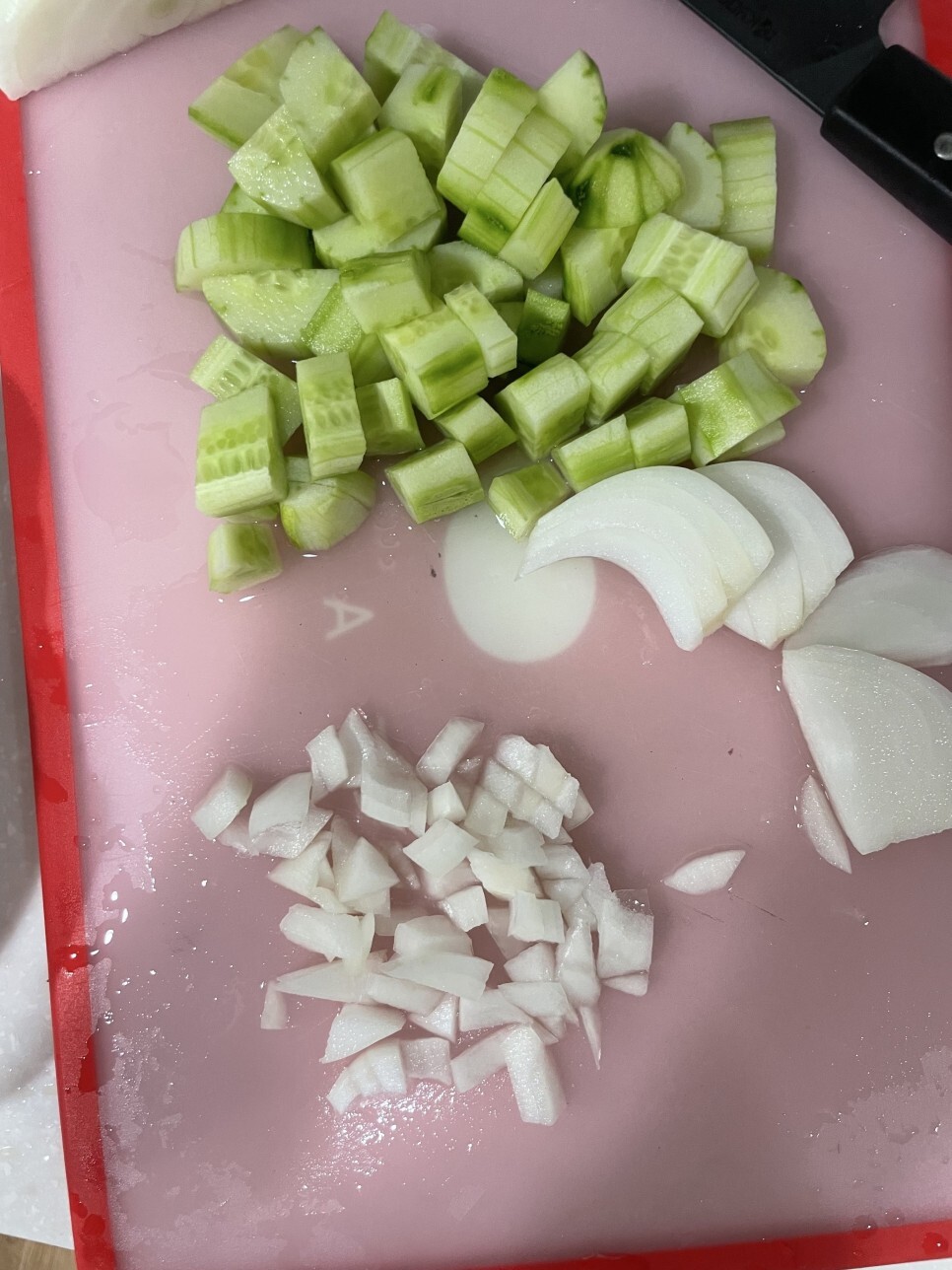 요리가 아니고 조리 수준! 오이 적당히 조각조각 양파는 잘게자르고 닭가슴살이랑 깻잎까지 넣어서 밥이랑 잘 비벼준다~~
